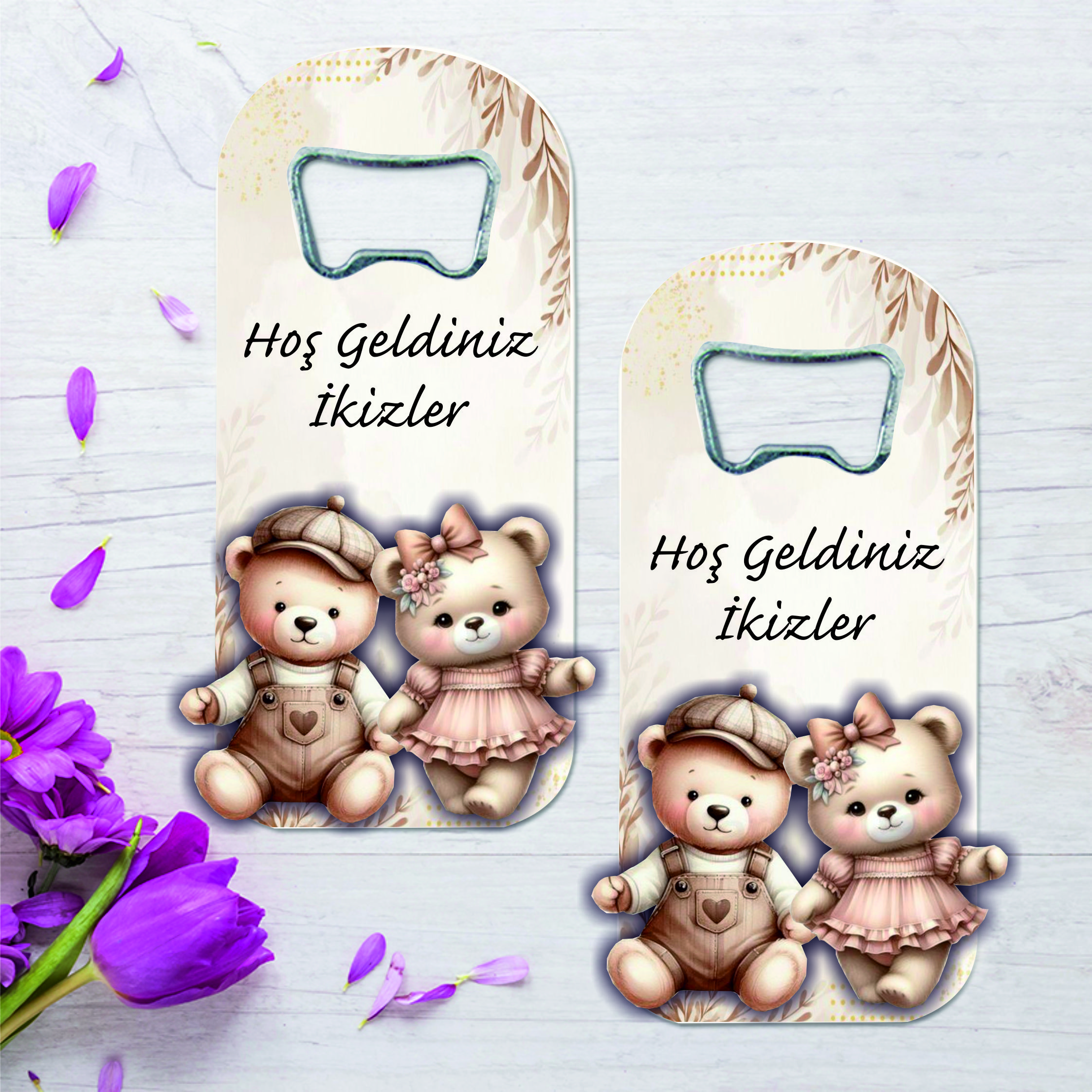 ikiz bebek ayıcık Temalı Ahşap Kabartmalı Açacak Magnet